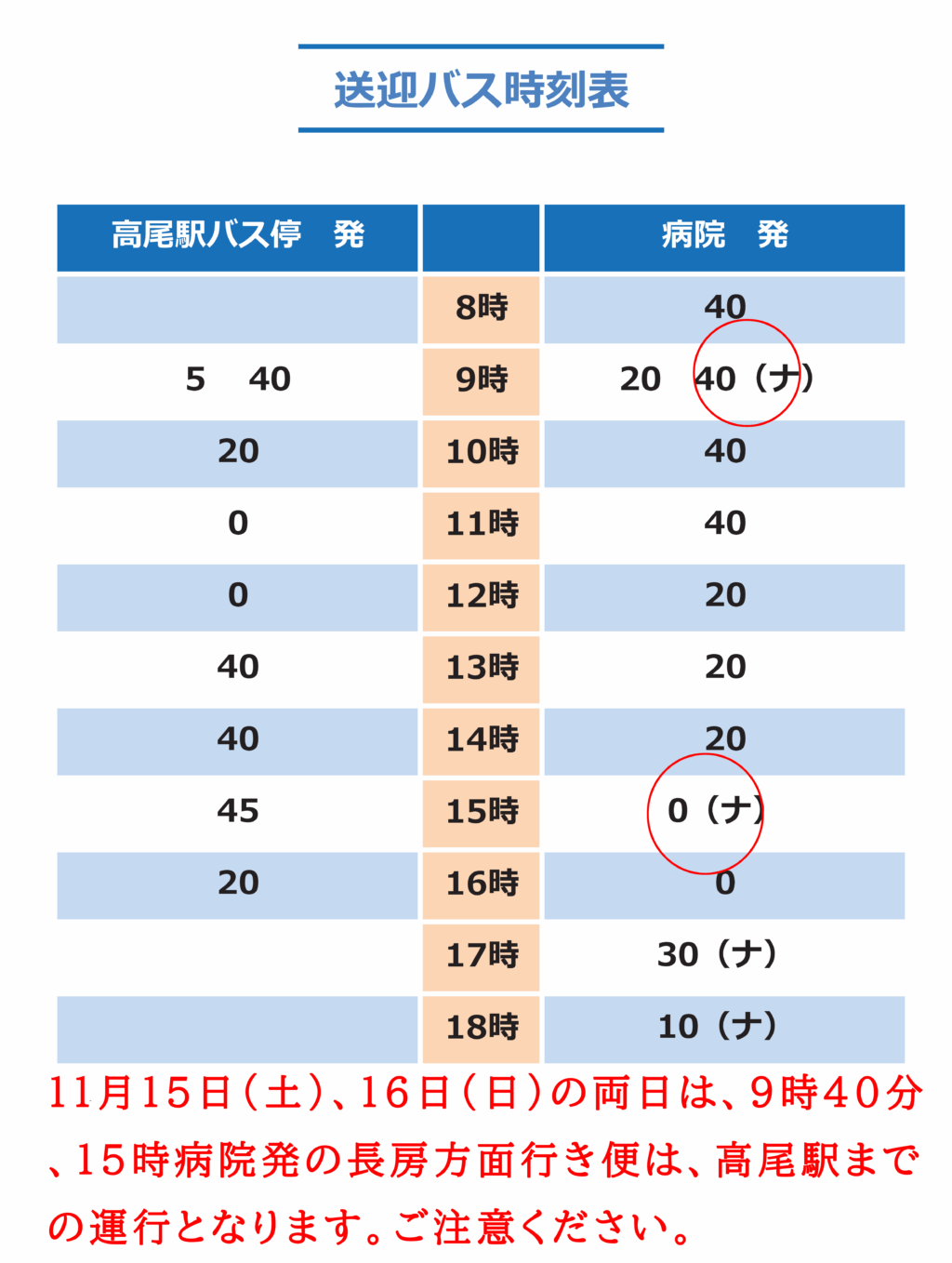 下記、時刻表の通り9時40分と15時病院発の長房方面行きの便は、両日とも高尾駅までの短縮運行となり、交通規制のため高尾駅から先の長房方面は運休となります。